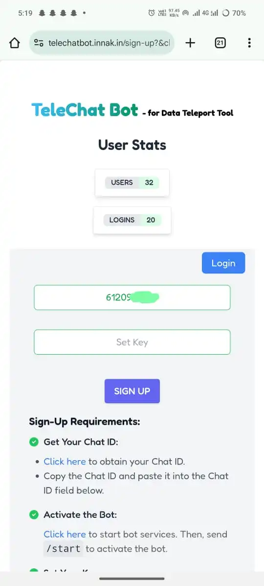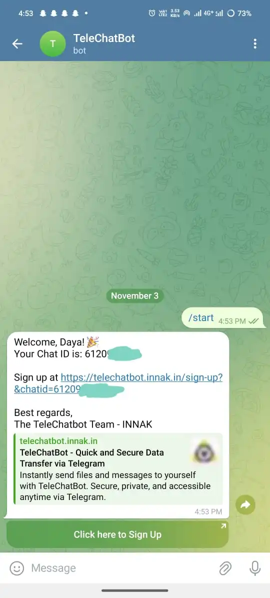 information. Simply sign up for TeleChatBot on Telegram, and once you receive your unique key, there's no